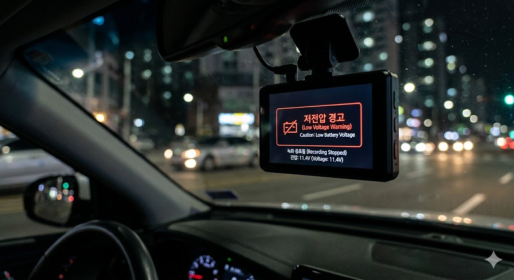 제일 확실한 경고였는데 제가 무시했던 부분입니다. 주차 녹화 모드일 때 아침에 차에 타면 항상 블랙박스가 꺼져 있거나, **"저전압 설정으로 인해 녹화를 종료합니다"**라는 멘트가 나오곤 했습니다.